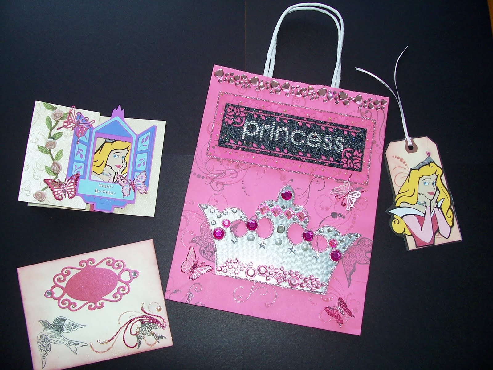 I used the Cricut cartridge, " HAPPILY EVER AFTER,"to create princess Aurora. The Crown pattern came from the same cartridge, and I built it up with lots of jewels, (rhinestones) fit for a princess! I found the jeweled word "princess" at my local Joanne's on clearance! Perfect! The label on the envelope is cut out from a SHAPEABILITIES die from a SPELLBINDERS.